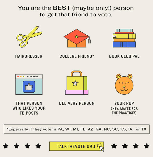 That means you're the best person to #TalkTheVote with your friends and family. All it takes is: